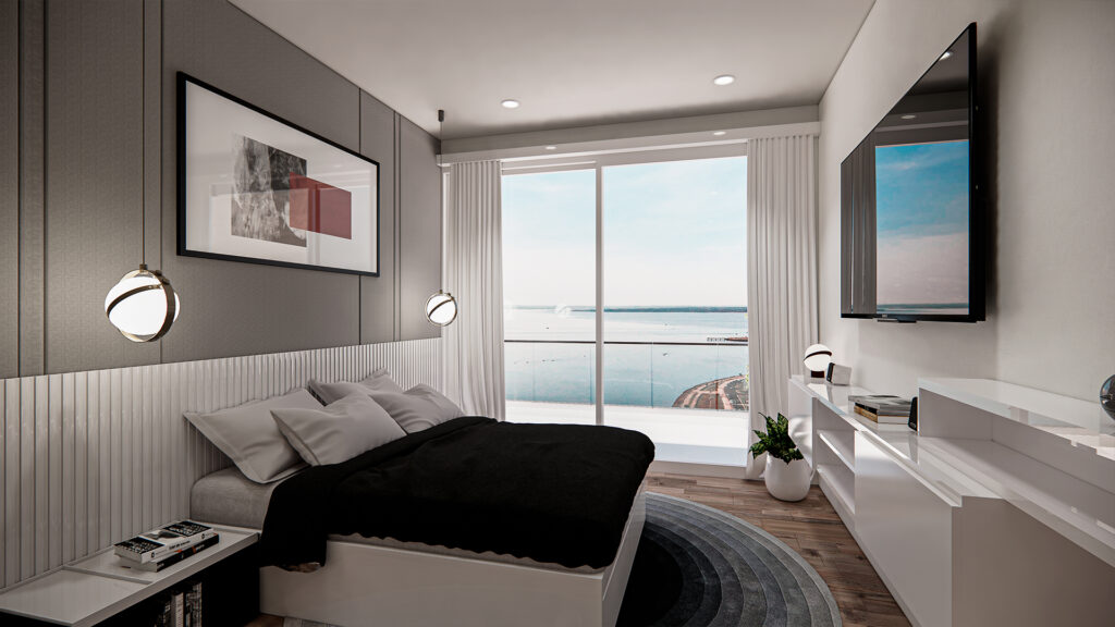 Nuestros departamentos de tres habitaciones en Victoria Tower Residence destacan por su amplitud y luminosidad excepcionales. Con vistas panorámicas, ofrecen una experiencia de confort incomparable. Una mira al sur de la ciudad y otra brinda una vista impresionante del Río Paraná. Cada unidad tiene 175 m2